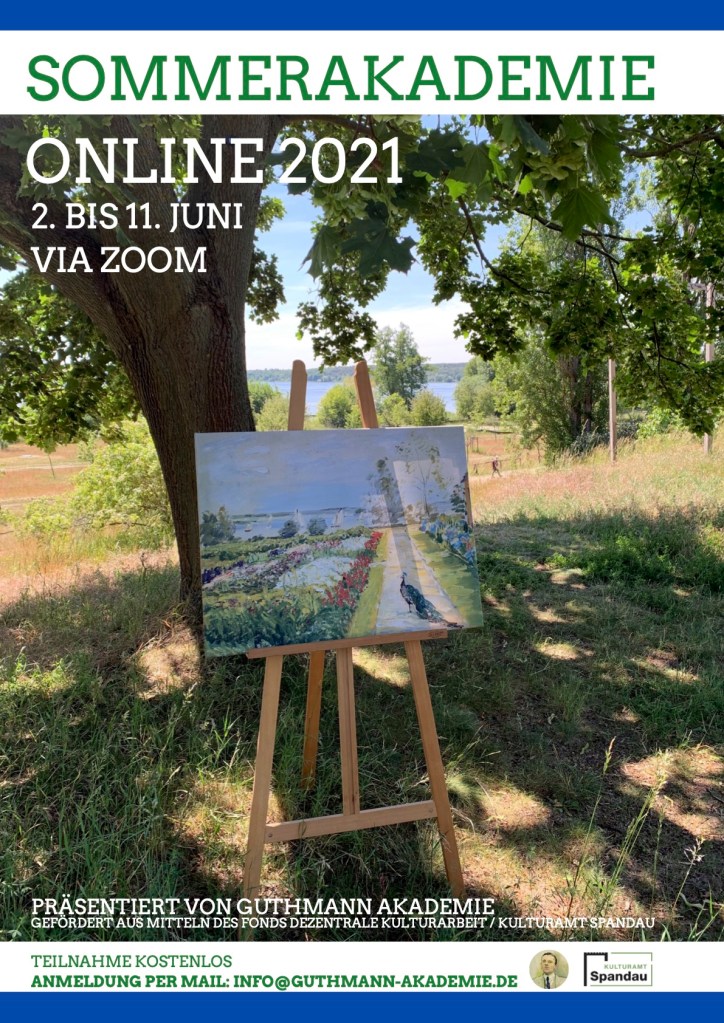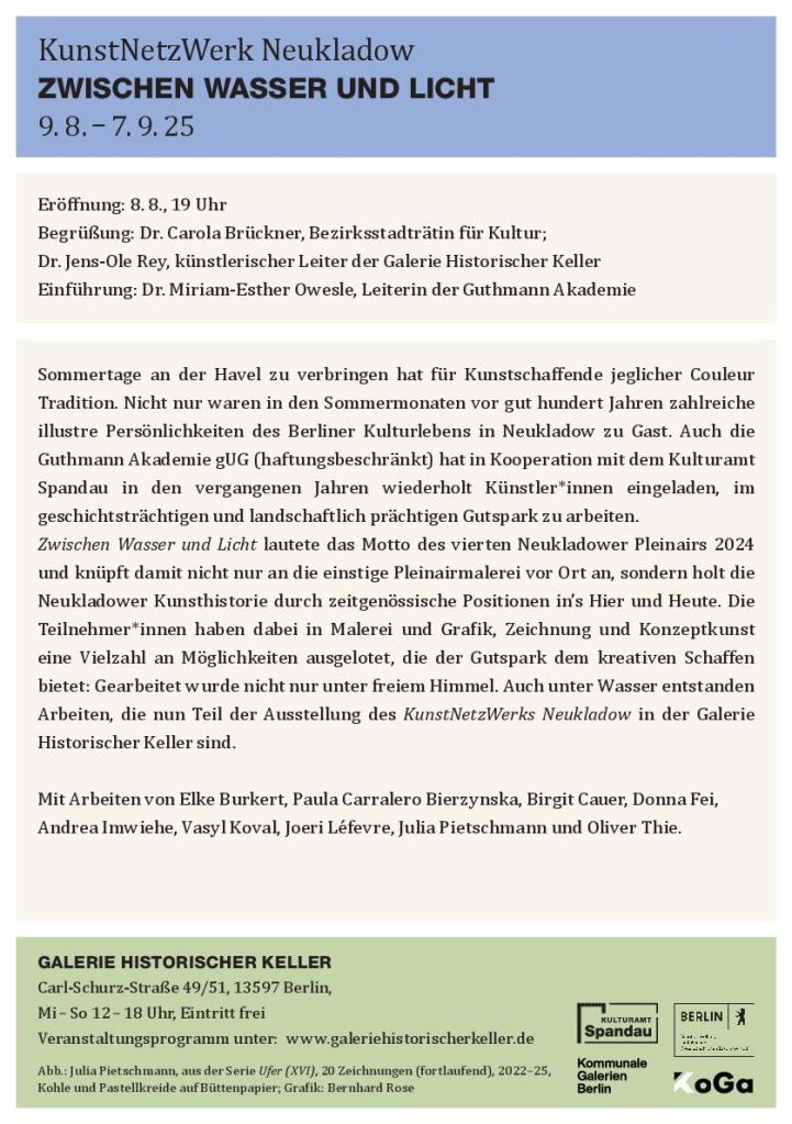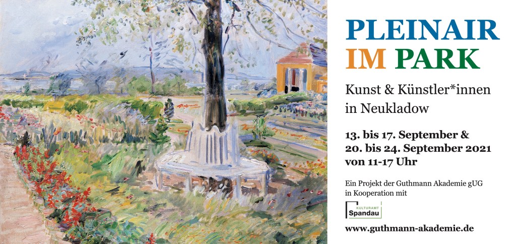 Sommertage an der Havel zu verbringen hat für Künstler*innen in Berlin und über die Grenzen Berlins hinaus mittlerweile Tradition: Zum vierten Mal veranstaltet die Guthmann Akademie gUG (haftungsbeschränkt) in Kooperation mit dem Kulturamt Spandau in diesem Jahr wieder ein Symposium, zu dem in der Zeit vom 03. bis 09.06.2024 zehn bildende Künstlerinnen und Künstler eingeladen sind, im Gutspark Neukladow zum Thema Zwischen Wasser und Licht im Rahmen eines Pleinairs zu arbeiten. Dabei ist es erklärtes Ziel der Guthmann Akademie, mit dem Pleinair im Park an die künstlerisch geprägte Kulturgeschichte Neukladows anzuknüpfen und die Neukladower Historie in’s Hier und Heute zu übersetzen.