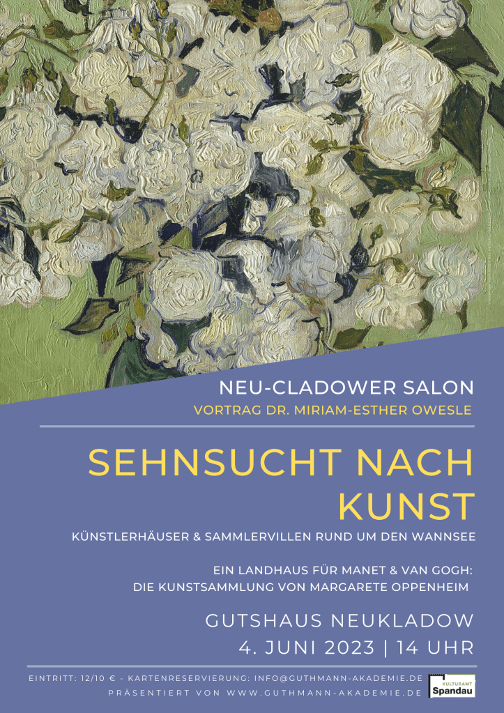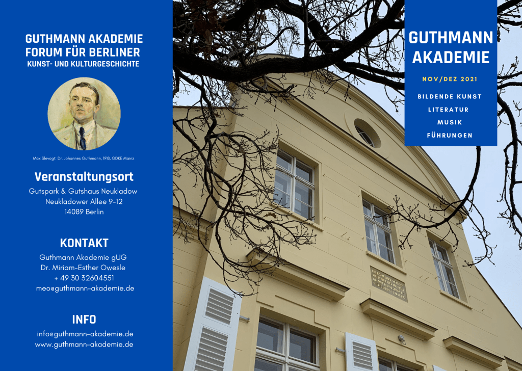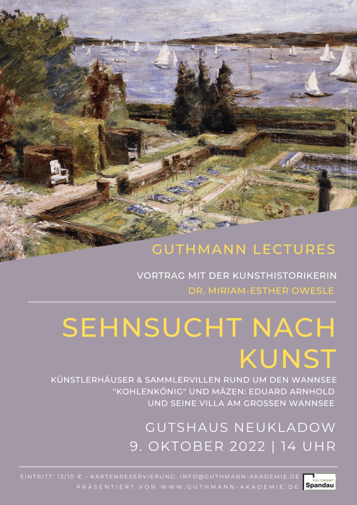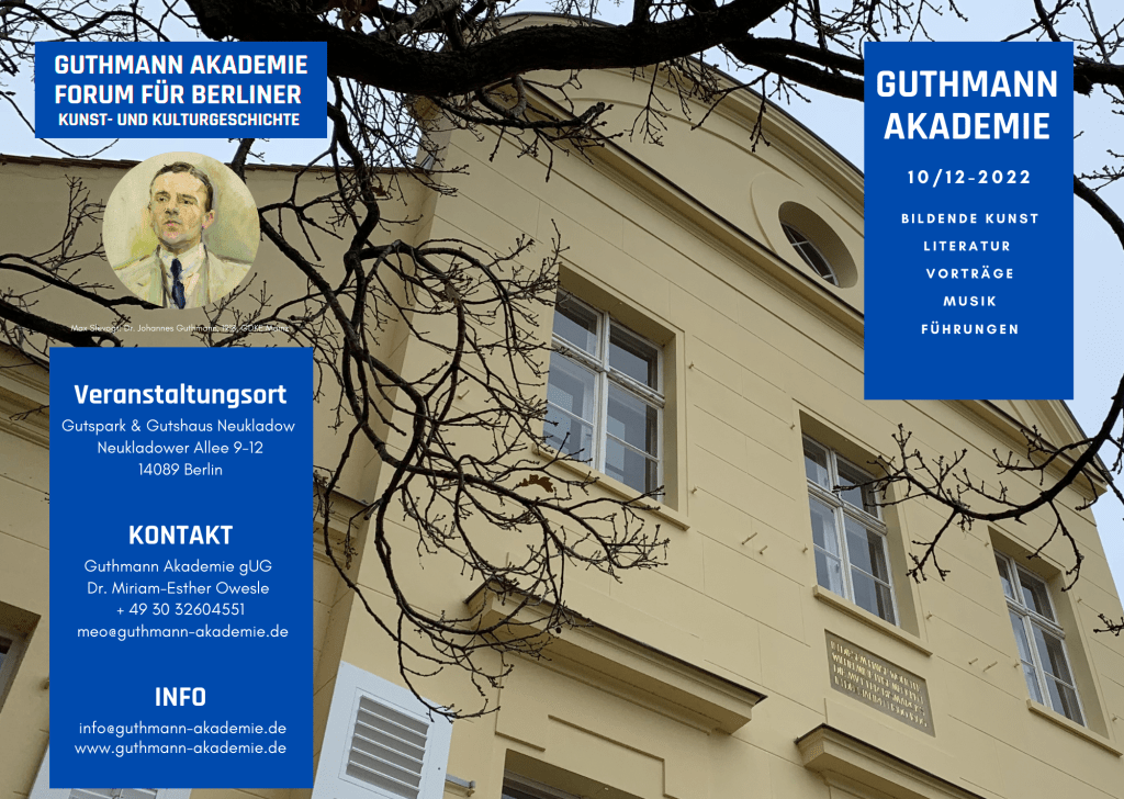 Als Gast der Villa Oppenheim lädt die Guthmann Akademie zu gedanklichen Spaziergängen in jene Zeit ein, in der sich wohlhabende Bürger durch das Sammeln von Kunst ein Refugium inmitten soziokultureller Umwälzungen schufen und in der die 1908 gegründete „Deputation für Kunstzwecke“ der Stadt Charlottenburg der kaiserlichen Kunstdoktrin mit einer liberalen Kulturpolitik begegnete.