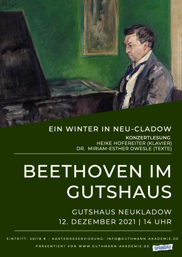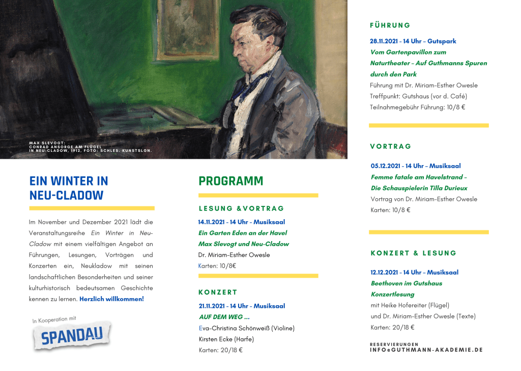 In einer musikalisch-literarischen Soirée erzählen die Pianistin Heike Hofereiter und die Kunsthistorikerin Miriam-Esther Owesle von dem Glauben an die Unvergänglichkeit des Schönen im Spiegel der Biographie des Schriftstellers und Sammlers Johannes Guthmann (1876-1956). Dieser hatte vor rund hundert Jahren in dem frühklassizistischen Gutshaus Neu-Cladow einen Kreis illustrer Gäste um sich geschart, zu denen der impressionistische Maler Max Slevogt und der Bildhauer August Gaul ebenso gehörten wie der Kunsthändler Paul Cassirer und die Schauspielerin Tilla Durieux, der Schriftsteller Gerhart Hauptmann, der Theaterintendant Max Reinhardt sowie der spätere Außenminister Walther Rathenau. In ihrem Buch „‚Neu-Cladow und nichts anderes!‘ – Johannes Guthmanns Traum vom Arkadien an der Havel“ (be.bra wissenschaft verlag 2014) hat die Kunsthistorikerin Miriam-Esther Owesle die sprühend geistvolle Atmosphäre der Blütezeit Neu-Cladows eingefangen und lässt im literarisch-musikalischen Dialog mit der Pianistin Heike Hofereiter den neuromantischen Traum Guthmanns von einem Arkadien an der Havel lebendig werden.