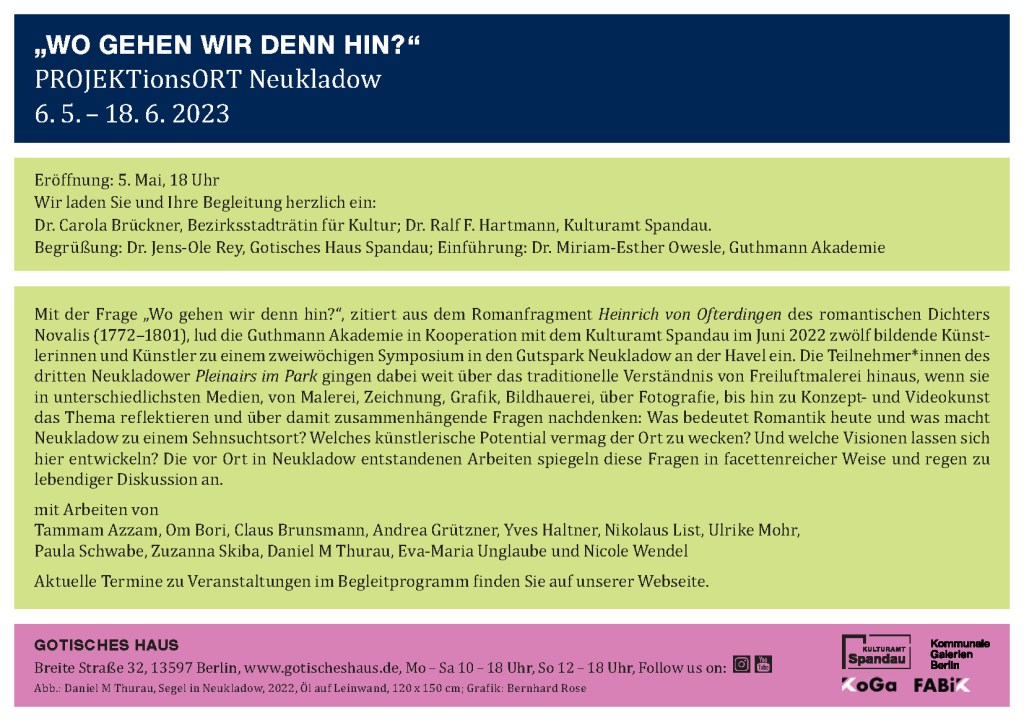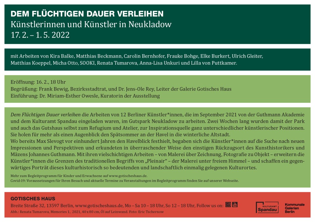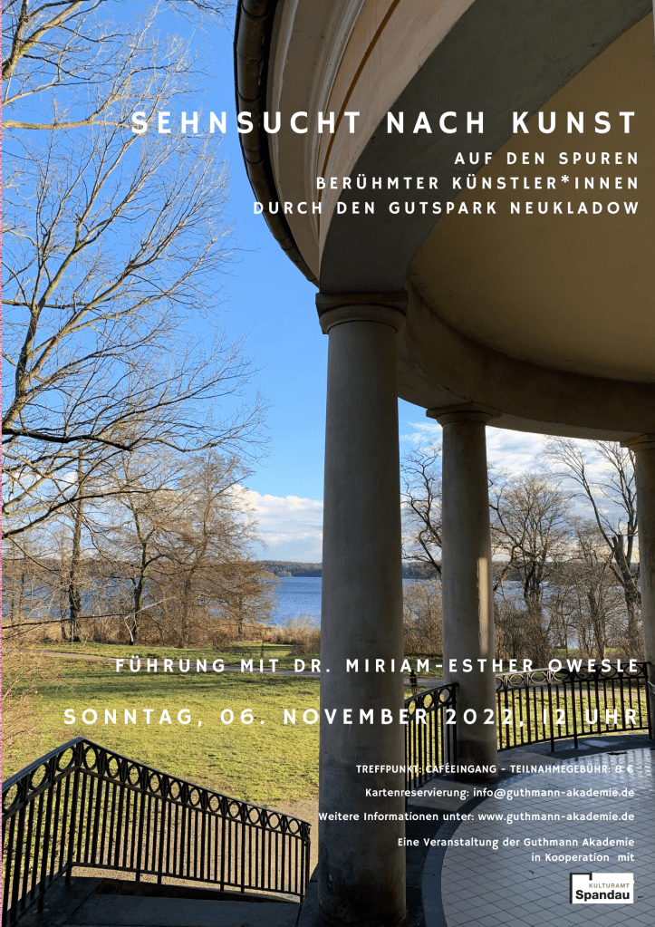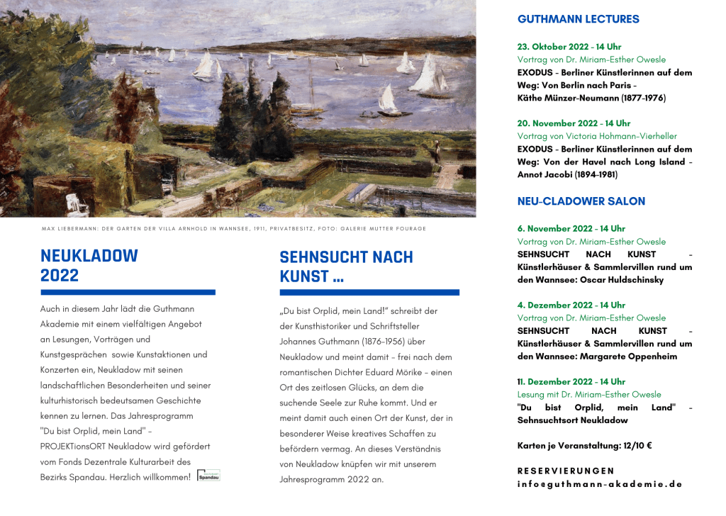 Anlässlich des Kulturfests im Rahmen des offenen Denkmals nimmt die Guthmann Akademie Neukladow als Ort der Erinnerungskultur in den Blick und richtet dabei den Fokus auf ihr langjähriges Engagement, Neukladow als einen Ort sichtbar zu machen, der sich in hervorragender Weise dazu eignet, Künstlerinnen und Künstlern zu künstlerischem Schaffen zu inspirieren und damit eine Brücke zur besonderen Historie des Ortes zu schlagen, an dem Kunst bereits vor hundert Jahren eine wichtige Rolle gespielt und zur Entstehung von Werken geführt hat, die Kunstgeschichte geschrieben haben.