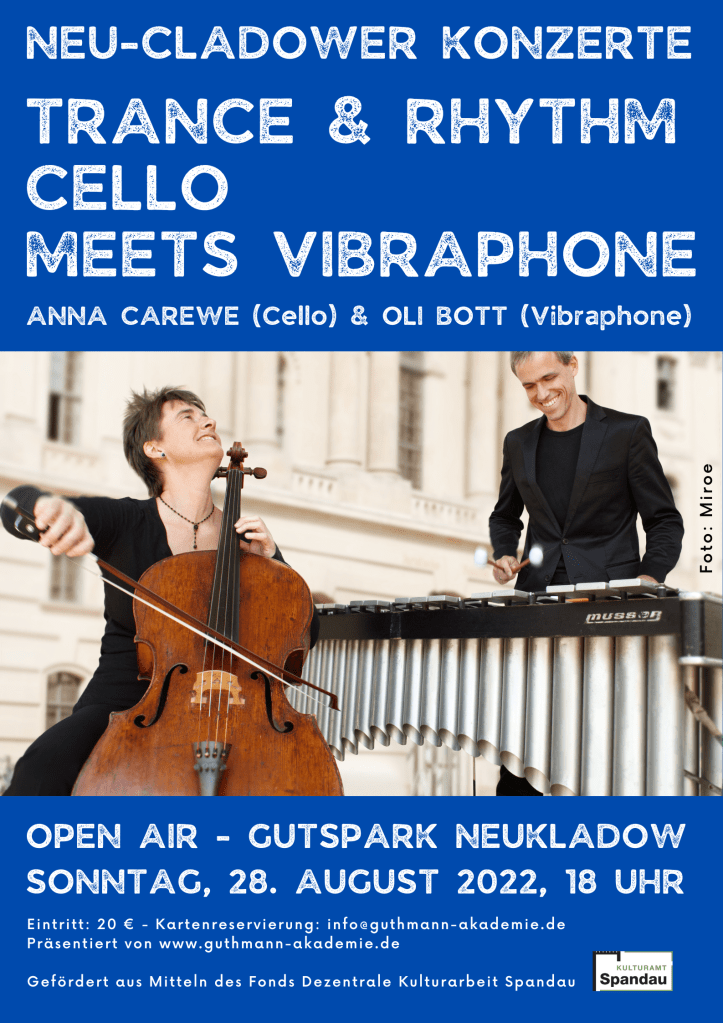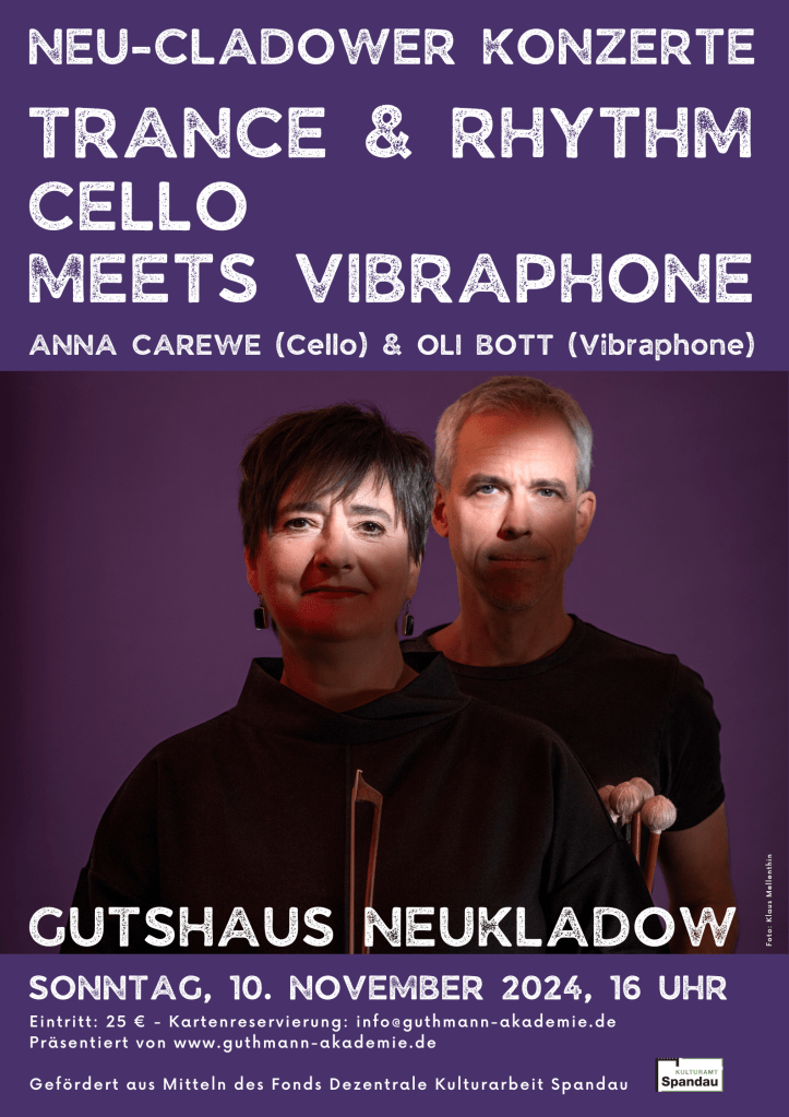 Nach ihrem fulminanten Open Air im Gutspark Neukladow freuen wir uns sehr, die Cellistin Anna Carewe und den Vibraphonisten Oli Bott erneut in Neukladow begrüßen zu dürfen – diesmal im historischen Musisaal, wo das Duo am 10. November 2024 um 16 Uhr seine brandneue CD Trance & Rhythm vorstellen wird, die jüngst bei Hänssler Classic erschienen ist, von der es in der Presse heißt: