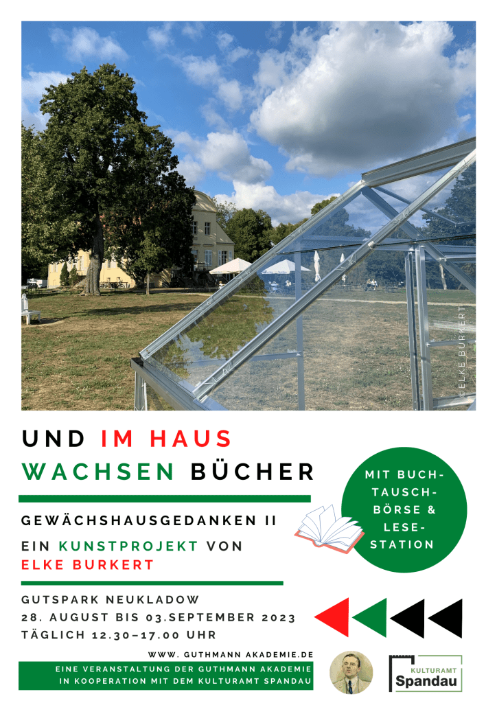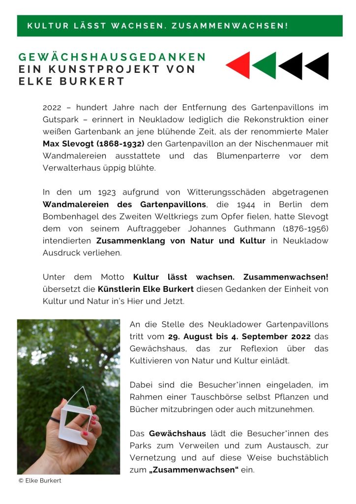 Elke Burkert inszeniert im Rahmen der Ausstellung ihre 2022 und 2023 mit großem Publikumserfolg präsentierte Kunstaktion Gewächshausgedanken vermittels einer Licht-Nebel-Installation neu und erinnert damit an die Abtragung des Gartenpavillons und seiner Wandgemälde vor 100 Jahren. Einmal mehr wird dabei das Gewächshaus im Gutspark zum Ort der Begegnung und Vernetzung und lädt die Besucher*innen des Gutsparks ein, sich aktiv mit der kulturgeschichtlichen Besonderheit des Ortes zu beschäftigen. Anlässlich der Finissage am 1. September 2024 setzt Dr. Miriam-Esther Owesle das Ausstellungsthema in seinen kunstgeschichtlichen Kontext. und lädt um 14 Uhr im Musiksaal zum Vortrag „Ein Garten Eden an der Havel – Max Slevogt und Neukladow“ ein.