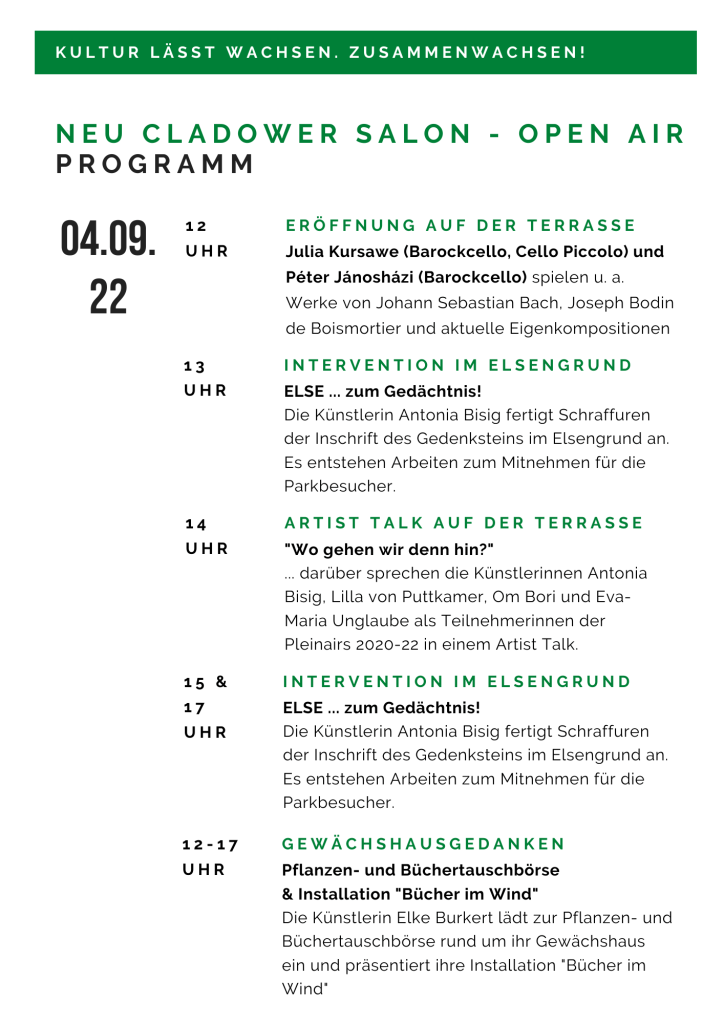 Um 14 Uhr spricht die Kunsthistorikerin Dr. Miriam-Esther Owesle zum Thema ÜBER FARBE in Neukladow – Von der Impression zur Installation. Um 15 Uhr lädt die Künstlerin Elke Burkert bei gutem Wetter zum Rundgang durch den Park und wird dort installative Arbeiten präsentieren. Um 16 Uhr laden die Künstlerinnen zum Terrassentalk auf die historische Gutshausveranda ein.