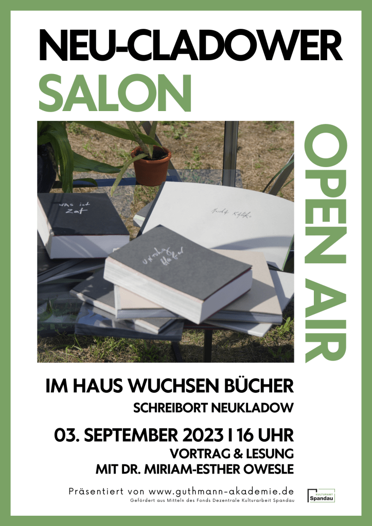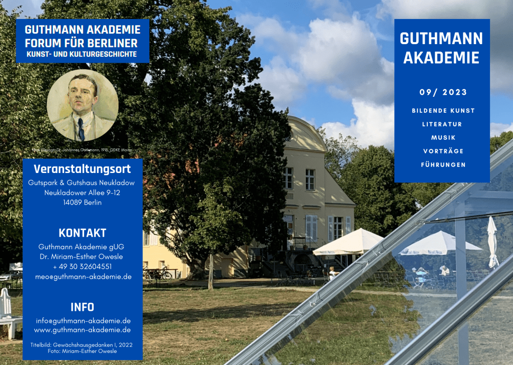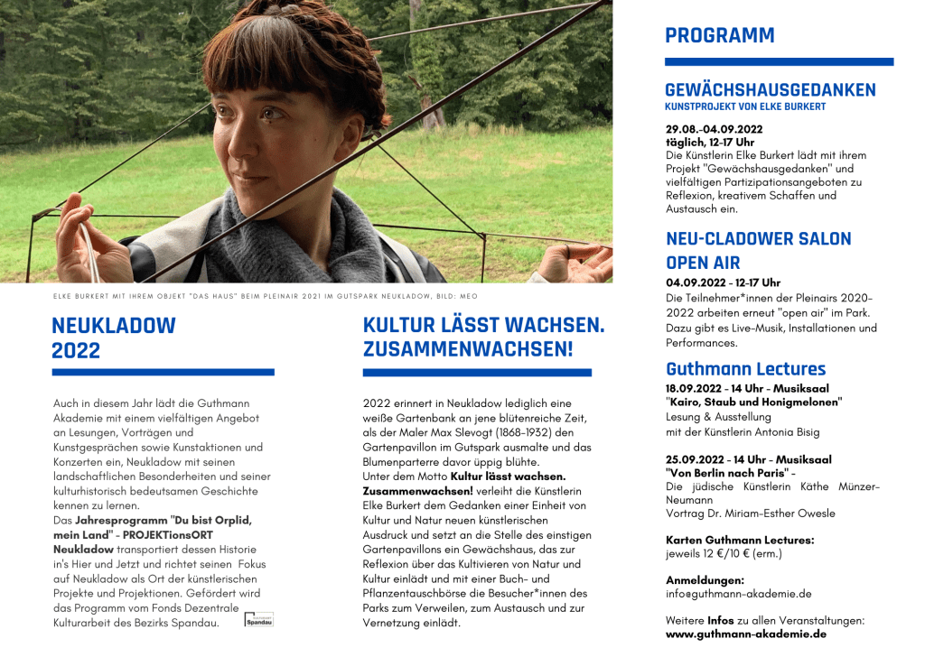 Vor diesem Hintergrund und auch im Hinblick auf das Jubiläum des Veranstaltungsformats Neu-Cladower Salon, dessen Bestehen sich 2023 zum zehnten Mal jährt, lädt die Guthmann Akademie in diesem Jahr mit einem facettenreichen Veranstaltungsangebot nach Neukladow ein.