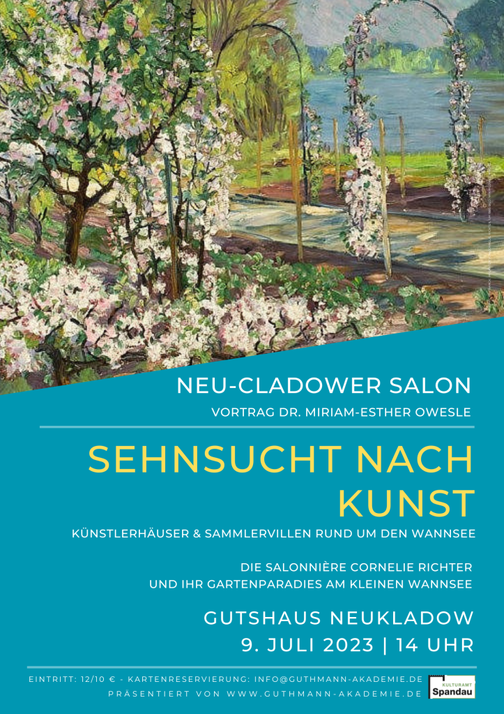 In heiter-lichtdurchwirkten Gemälden hat uns der Maler Philipp Franck jenen Garten überliefert, den zu hegen und pflegen der Witwe des Malerfürsten Gustav Richter (1823-1884) Herzensangelegenheit war. Mit ihrem Landsitz auf dem Wehrhorn – einer Halbinsel zwischen Kleinem Wannsee und Pohlesee – schuf Cornelie Richter (1842-1922) insbesondere in den Jahren zwischen 1890 und 1914 ein idyllisches Refugium, in dem auch die Kultur reiche Blüten trieb. Galten bereits zu Lebzeiten ihres Mannes die Atelierfeste in der gemeinsamen Stadtwohnung als legendäre Zusammenkünfte der geistig-kulturellen Elite der Gründerzeit, so empfing Cornelie Richter in ihrem 1888 von Hermann Ende erbauten Sommerdomizil in der Villenkolonie Alsen insbesondere jenen Kreis, mit dem sie in engstem Kontakt stand – darunter bedeutende Vertreter der künstlerischen Avantgarde. Der Dichter und Dramatiker Hugo von Hofmannsthal war dabei ebenso gern gesehener und häufiger Gast in der Hohenzollernstraße 12 wie der Schriftsteller und Mäzen Harry Graf Kessler. Der Salonnière Cornelie Richter und ihrem Wannseer Refugium ist der Oktober-Vortrag des Neu-Cladower Salons in der Galerie Mutter Fourage gewidmet.