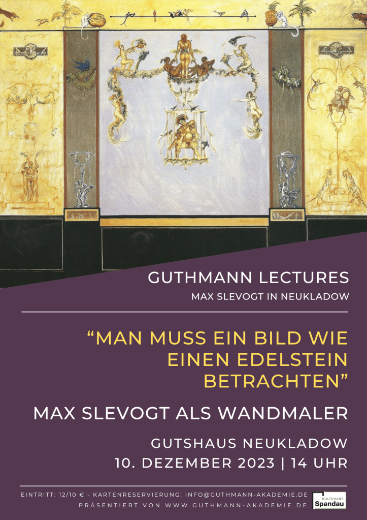Im Oktober 2018 jährt sich der Geburtstag des Malers, Zeichners und Graphikers Max Slevogt (1868-1932) zum hundertfünfzigsten Mal. Die Guthmann Akademie nimmt dies zum Anlass, Slevogt mit einer Vortragsreihe zu ehren. In ihrem Zentrum stehen Leben und Schaffen eines Künstlers, der zusammen mit Max Liebermann und Lovis Corinth dem großen „Dreigestirn des deutschen Impressionismus“ zugerechnet wird. Dabei widmet sich die Guthmann Akademie dem Künstler an einer seiner wichtigsten Wirkungsstätten: in Neu-Cladow!