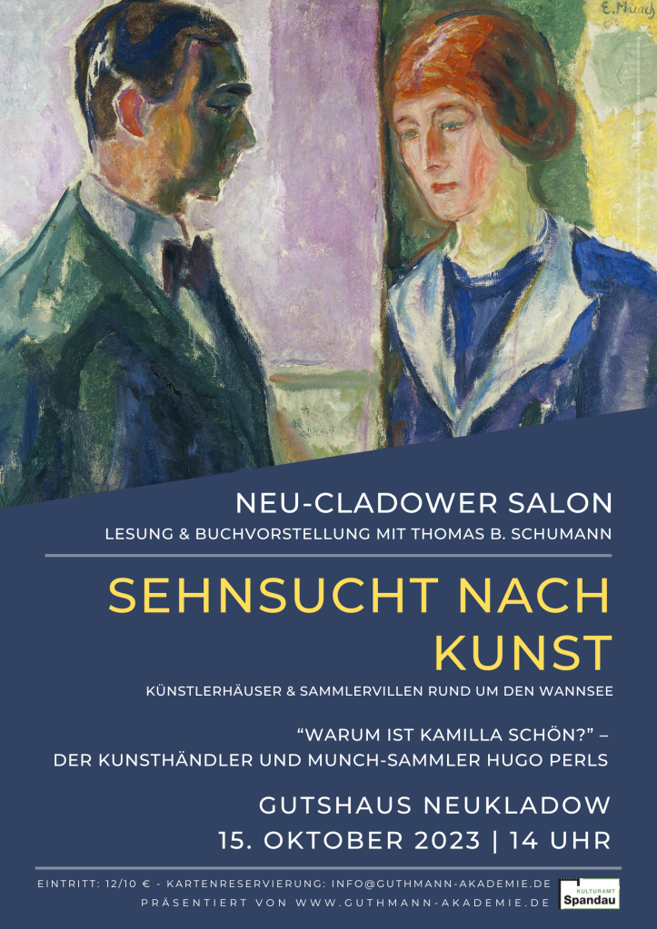 Immer wieder zog es den impressionistischen Maler Max Slevogt nach Neu-Cladow, um hier am Havelstrand die Naturschönheit des Ortes und dessen geistig anregende Atmosphäre mit Pinsel und Zeichenstift festzuhalten. Noch heute kündet Slevogts Neu-Cladower Gemäldezyklus von jener Aufbruchstimmung, die Haus und Park um 1910 durch das Wirken des Kunsthistorikers und Schriftstellers Johannes Guthmann (1876-1956) erfüllte. Durch Guthmann wurde Neu-Cladow zu einem modernen Musenhof, an dem sich Bildende Künstler und Schriftsteller, Schauspieler und Musiker ein rekreativ-kreatives Stelldichein gaben – darunter auch zahlreiche Mitglieder der Berliner Secession. Sie schufen nicht nur Werke in Neu-Cladow, sondern auch für Neu-Cladow: neben Arbeiten von Max Slevogt befanden sich in der Kunstsammlung des Hausherrn Arbeiten von Hans Purrmann und August Gaul, Ernst Barlach und Georg Kolbe. Der Verbindung von Johannes Guthmann und Neu-Cladow zur Berliner Secession widmet sich ein Vortrag der Leiterin der Guthmann Akademie Dr. Miriam-Esther Owesle im Rahmen der Guthmann Lectures am 19. November 2017 um 15 Uhr. Dann heißt es im Musiksaal des Gutshauses Neu-Cladow: „Mit der Leinwand an die Havel – Neu-Cladow und die Berliner Secession“.