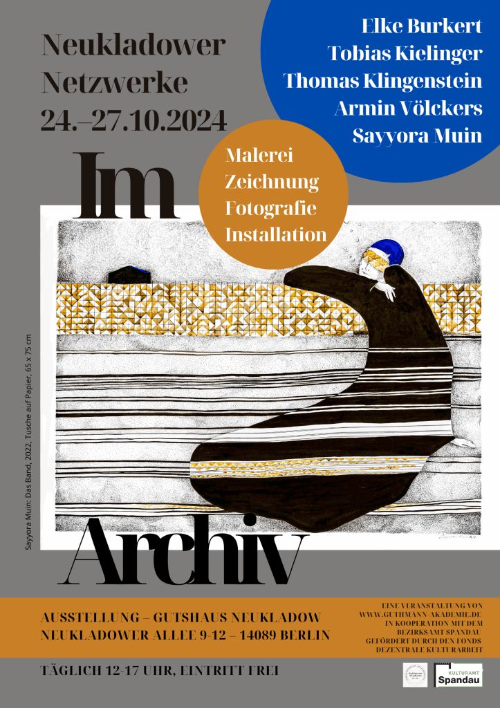 Für die Aufarbeitung der Geschichte Neukladows spielt Archivarbeit eine wichtige Rolle und rührt dabei an ein für den Ort zentrales Thema: Erinnerungskultur! In ihrer Funktion als Orte des Sammelns sind Archive insbesondere auch Gedächtnisspeicher, in denen kollektive wie persönliche Erinnerungen bewahrt werden. Und so facettenreich der Inhalt von Archiven ist, so mögen sie für einen jeden von uns höchst unterschiedliche Bedeutung haben. So wie für die fünf Künstlerinnen und Künstler der vierten Ausstellung des diesjährigen Jahresprogramms der Guthmann Akademie, das sich in vielfacher Weise der Erinnerungskultur rund um Neukladow annimmt. Mit Elke Burkert, Tobias Kielinger, Thomas Klingenstein, Armin Völckers und Sayyora Muin sind im Oktober 2024 im Rahmen der Ausstellung IM ARCHIV fünf bildende Künstlerinnen und Künstler zu Gast im Gutshaus und beziehen in den historischen Räumen vielgestaltige Positionen zum Thema. Seien Sie herzlich eingeladen, sich mit ihnen und ihren Malereien, Zeichnungen, Fotografien und Installationen auf „Archivrecherche“ zu begeben und mit den Künstlerinnen und Künstlern dabei auch persönlich in’s Gespräch zu kommen!