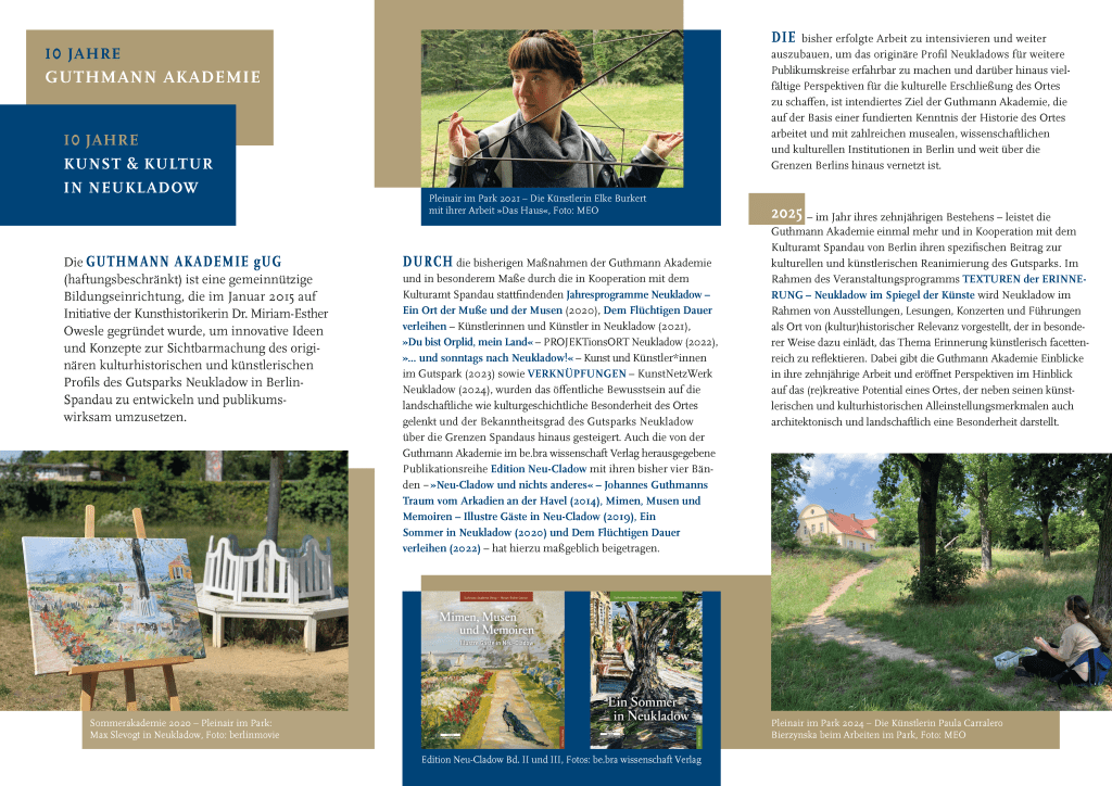 In diesem Jahr werden wir Rückschau halten und Neues vorstellen, um Neukladow als einen Ort sichtbar zu machen, als der er – aus unserer Sicht – gemeint ist: Ein Ort des künstlerischen Schaffens und des geistigen Austauschs, ein Ort der Kreativität und der Rekreation, ein Ort der Reflexion und der Muße. So dürfen Sie nach einer schöpferischen Pause gespannt sein auf neue Formate und Veranstaltungen im Herbst 2025. Auf bald in Neukladow – Ihre Guthmann Akademie!