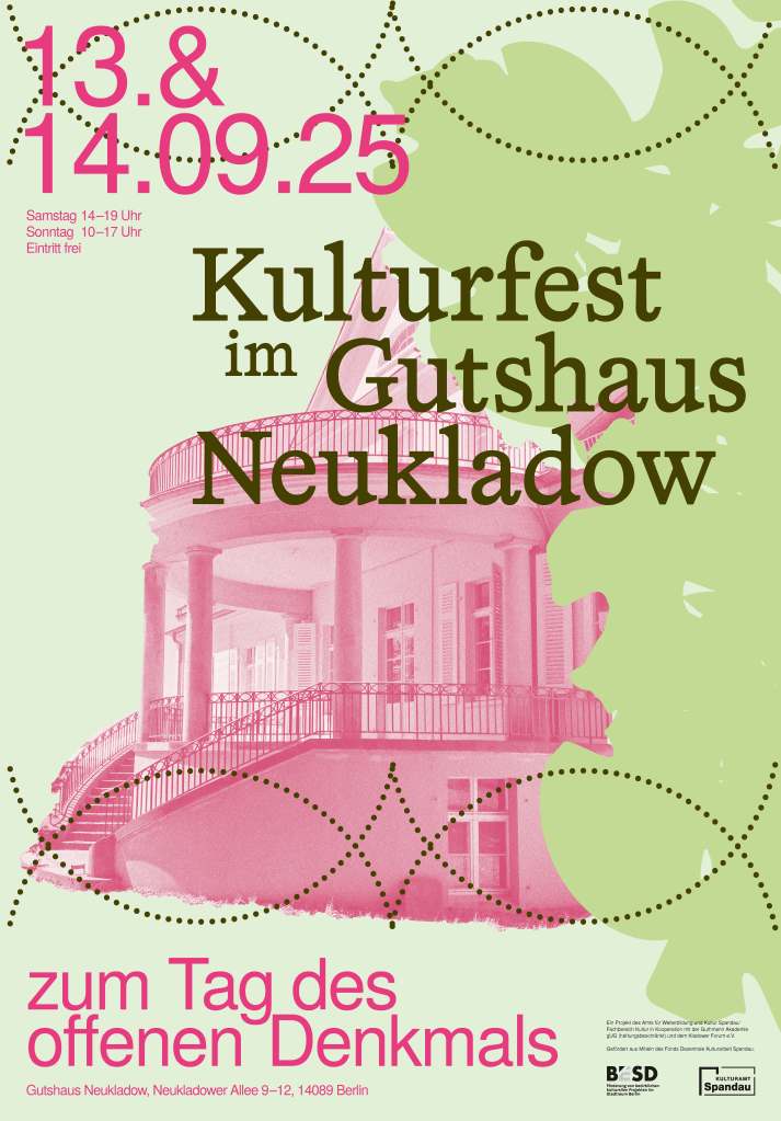 Zum diesjährigen Tag des offenen Denkmals lädt das Kulturamt Spandau zu einem besonderen Kulturfest in das historische Gutshaus Neukladow ein. Das um 1800 erbaute Ensemble am Havelufer, einst Treffpunkt der Berliner Gesellschaft und Heimat zahlreicher Kunst- und Kulturschaffender zu Zeiten Johannes Guthmanns, öffnet seine Türen für ein vielfältiges Programm aus Kunst, Musik und Geschichte.